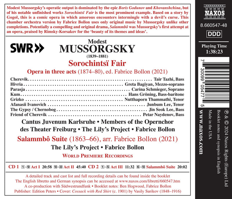 NaxosMussorgsky: Sorochintsï Fair & Salammbô Suite / Bollon, The Lily's ProjectBased on a story by Gogol, Modest Mussorgsky's unfinished Sorochintsi Fair is a comic opera in which amorous encounters intermingle with a...