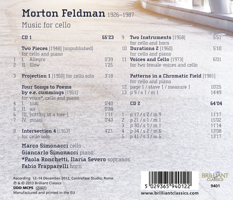 Brilliant ClassicsFeldman: Patterns in a Chromatic Field - Music for Cello / SimonacciAmerican composer Morton Feldman is best known for being a founding member of the New York School, a group of musicians and...