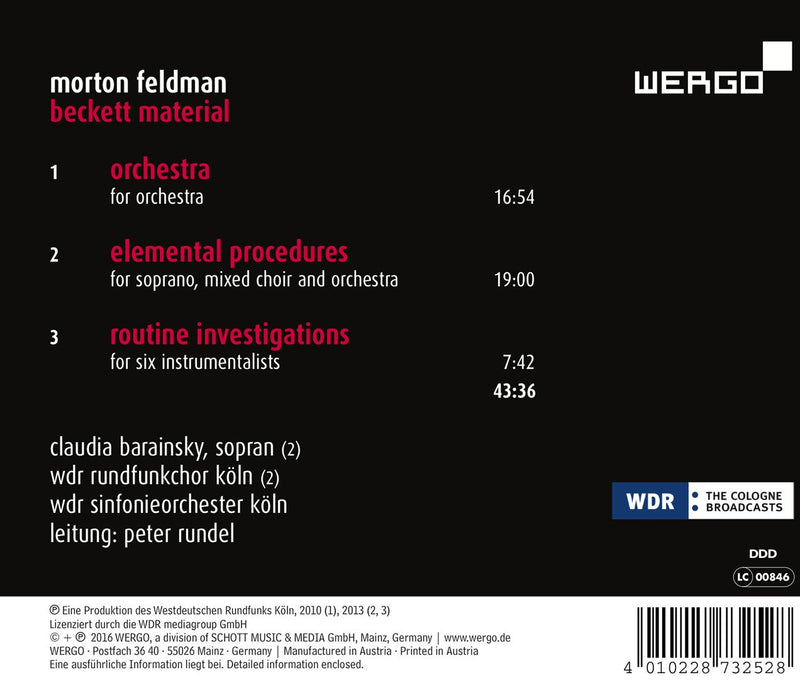 In 1976, Morton Feldman accepted a commission from the opera in Rome for the opera Neither. The works Orchestra, Elemental Procedures and Routine Investigations, represented a "triology" for Feldman with which he prepared himself for the work on his opera. In all thre epieces, Feldman uses a characteristic complex of material, clearly differentiated from his previous type of textural treatment and inserted as a fixed element into the course of the music.