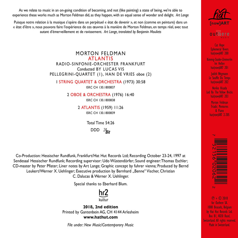 “As we relate to music in an on-going condition of becoming, and not (like painting) a state of being, we're able to experience these works much as Morton Feldman did, as they happen, with an equal sense of wonder and delight.” (Art Lange) A major figure in 20th-century music, Morton Feldman was a pioneer of indeterminate music, a development associated with the experimental New York School of Composers. Feldman’s works are characterized by notational innovations that he developed to create his characteristic sound: rhythms that seem to be free and floating, pitch shadings that seem softly unfocused, a generally quiet and slowly evolving music, and recurring asymmetric patterns. He wrote the title track of this album, Atlantis, in 1959.
