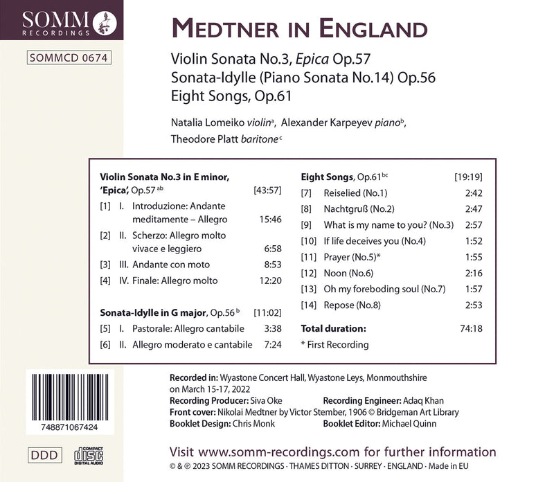 SOMM RecordingsMedtner in England / Lomeiko, Karpeyev, PlattSOMM Recordings announces Medtner in England, a revelatory new recording exploring the musical life of Nikolai Medtner, featuring violinist Natalia Lomeiko, pianist...