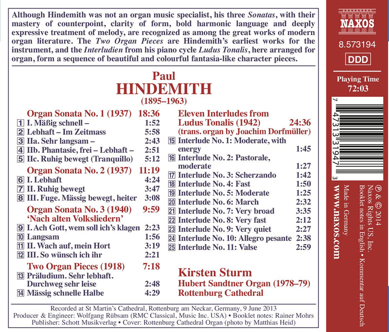 NaxosHindemith: Organ Sonatas Nos. 1-3; Eleven Interludes From Ludus Tonalis; Two Organ Pieces