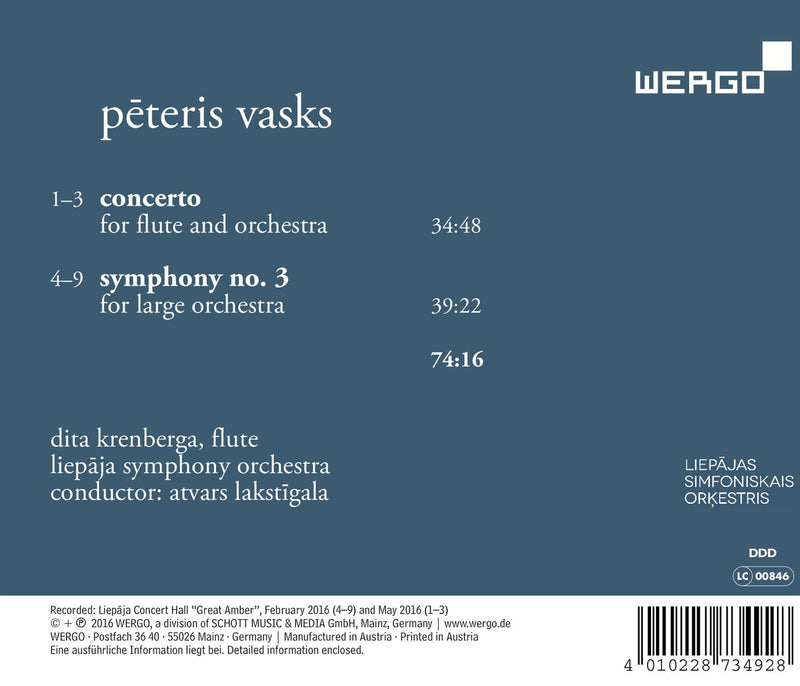WergoVasks: Flute Concerto & Symphony No. 3 / Lakstigala, Krenberga, Liepaja SymphonyThough Vasks in his early works was influenced by Bartók, Shostakovich, and the “New Polish School”, he was inspired after 1990 by...