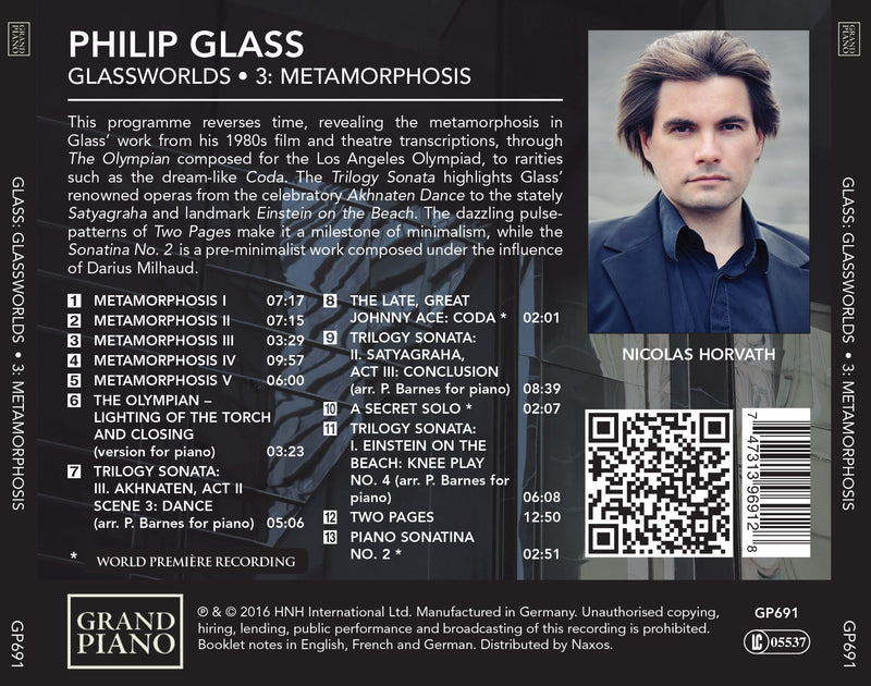 Grand PianoGlass – Glassworlds, Vol 3 / HorvathThis program reverses time, revealing the Metamorphosis in Glass’s work from his 1980s film and theatre transcriptions, through The Olympian composed for...