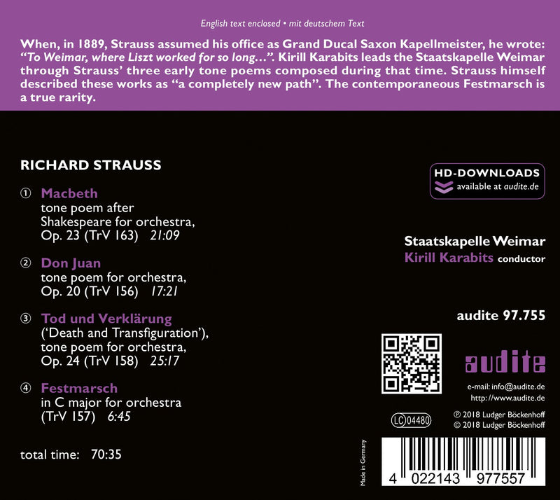 Audite MusikproduktionStrauss: Macbeth, Don Juan, Tod und Verklarung & Festmarsch / karabits, Staatskapelle Weimar