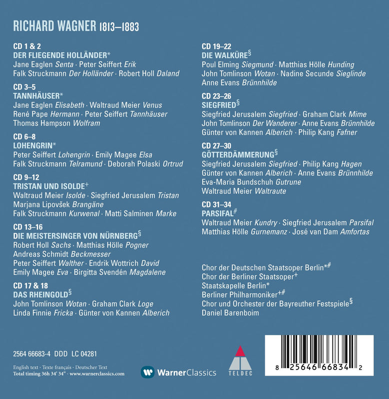 WARNER CLASSICSBARENBOIM COMPLETE WAGNER OPERASConductor Daniel Barenboim presents: Complete iconic life work of Wagner's Operas in a 34 CD Box set. Complete with track listing and...