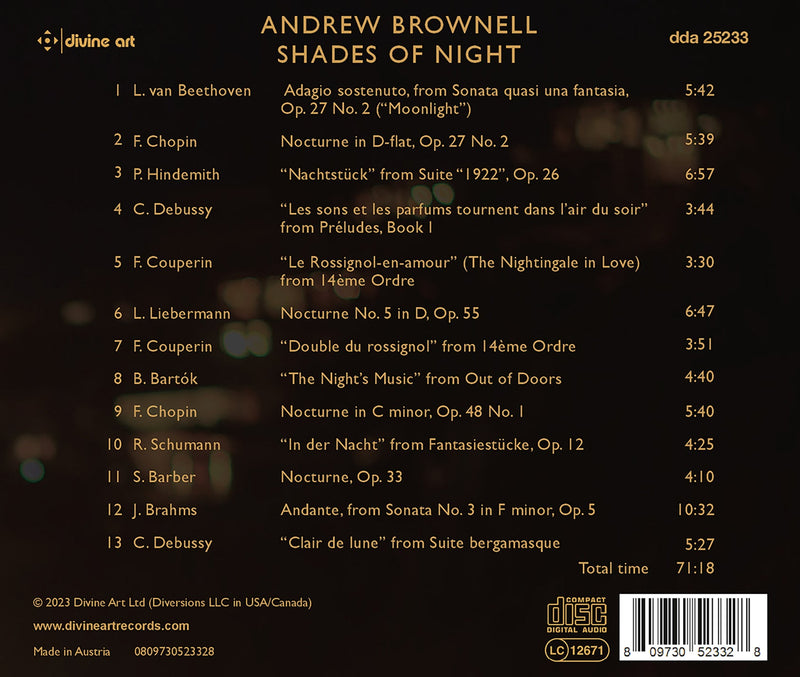 On SaleDivine ArtShades of Night - Nocturnal Music from Couperin to Liebermann / BrownellStep back to a time when the night was an antithesis to the clarity of illumined day. In the especially fertile imaginations...