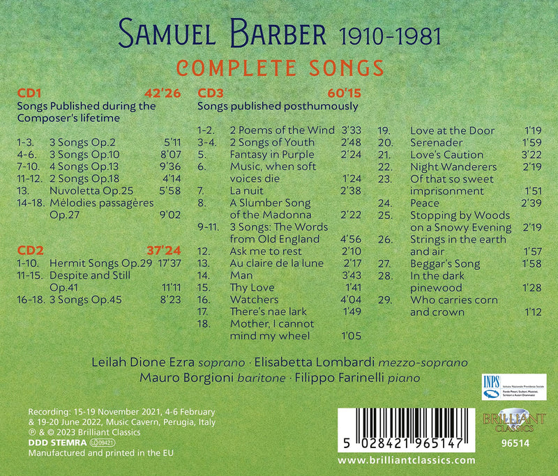 On SaleBrilliant ClassicsBarber: Complete SongsThe songs of Samuel Barber offer the beauty of his output in microcosm. ‘Complete’ in this context used to mean the 47...