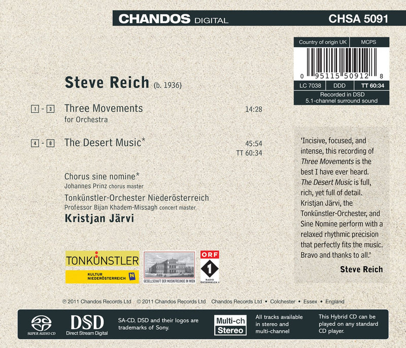 ChandosReich: The Desert Music, Three Movements / Jarvi, Chorus Sine Nomine, Tonkunstler Orchester, Niederosterreich