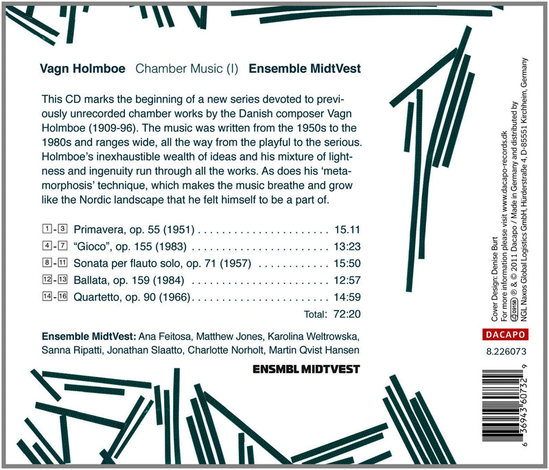 Dacapo ClassicalHolmboe: Chamber Music (II) / Ensemble MidtVestHOLMBOE Eco. Aspects. Sonata for Cello Solo. Quartetto Medico. Sextet • Ens MidtVest • DACAPO 8.226074 (70:28) The music of Vagn Holmboe...