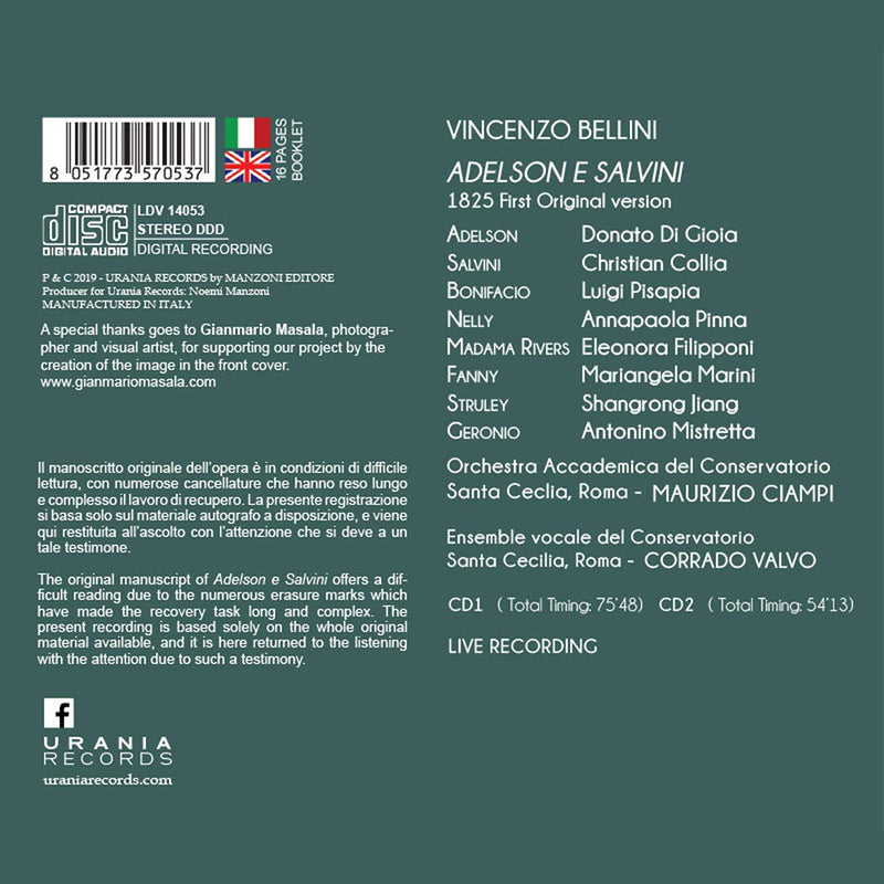Urania RecordsBellini: Adelson e Salvini / Ciampi, Santa Cecilia National OrchestraThe three-act opera semiseria Adelson e Salvini by Vincenzo Bellini was based on the 1772 novel Epreuves du Sentiment by Francois-Thomas-Marie de...