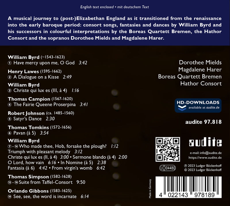 On SaleAudite MusikproduktionOn Byrd's Wings / Mields, Boreas Quartet Bremen, Hathor ConsortThe heyday of English consort music coincides with the exciting change in style from musical Renaissance to early Baroque between 1580 and...
