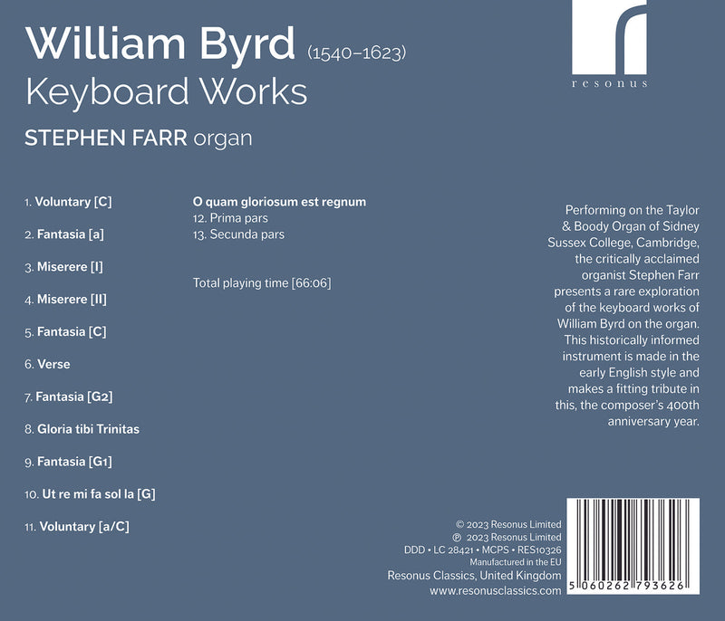 On SaleResonus ClassicsByrd: Keyboard WorksPerforming on the Taylor & Boody Organ of Sidney Sussex College, Cambridge, the critically acclaimed organist Stephen Farr presents a rare exploration...