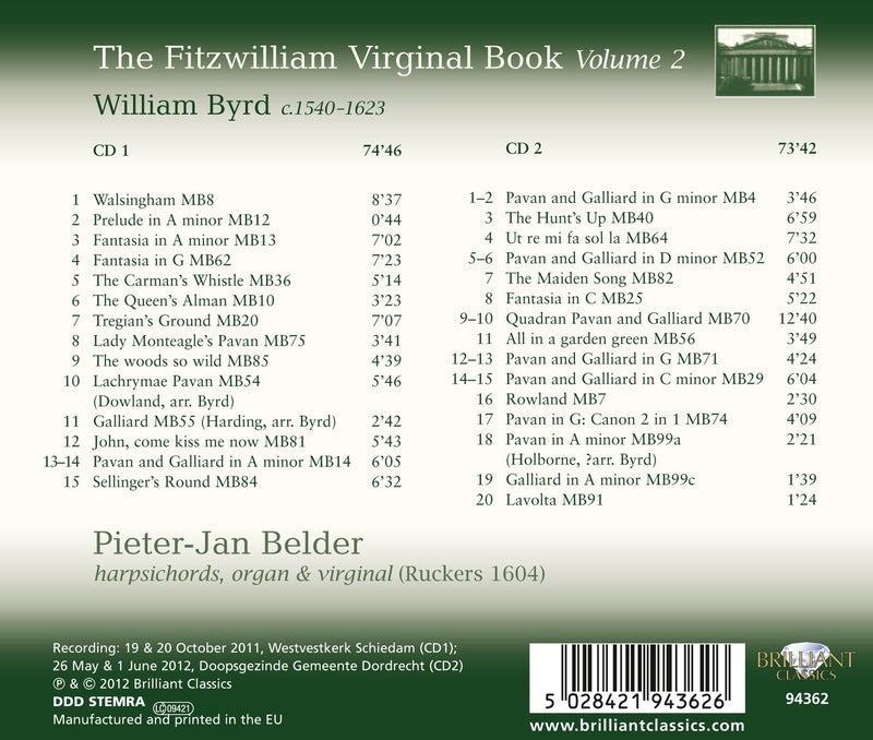 Brilliant ClassicsThe Fitzwilliam Virginal Book Vol 2 - William Byrd / BelderAmong the most prized exhibits of Fitzwilliam College, Cambridge, stands the Fitzwilliam Virginal Book, the largest surviving anthology of Elizabethan and Jacobean...