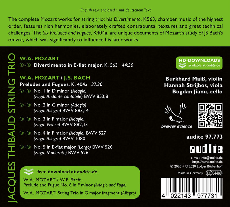 The complete Mozart works for string trio in a new recording with the Jacques Thibaud String Trio: alongside the well-known Divertimento, K....