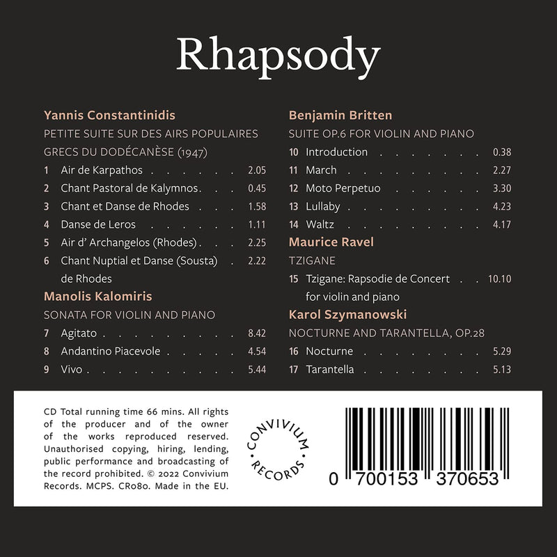 On SaleConvivium RecordsRhapsody - 20th Century Violin MasterpiecesExplore this debut album by Lisa Archontidi-Tsaldaraki & Panayotis Archontides, which brings together both well and lesser-known repertoire for violin and piano...