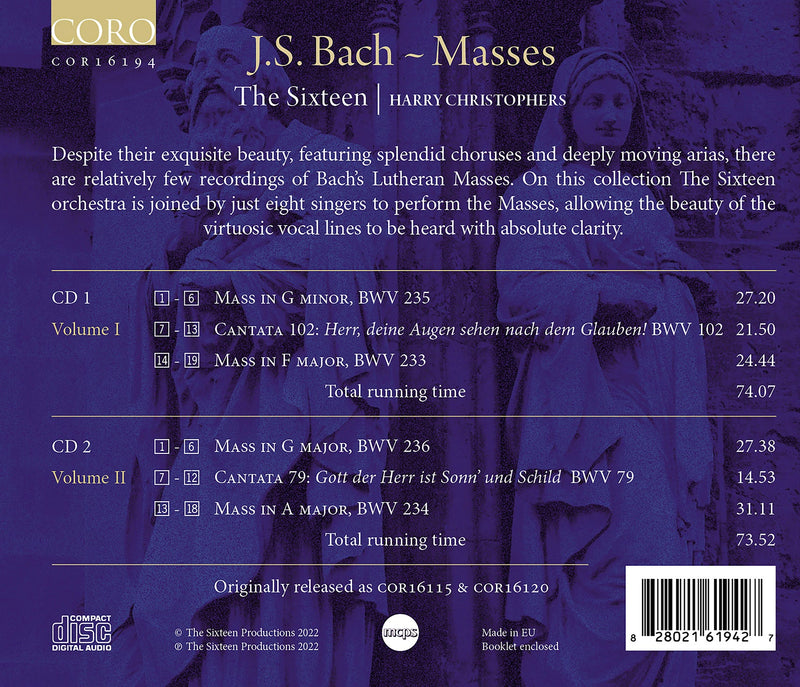 Bach’s four Lutheran Masses feature almost no Lutheran material at all. Sometimes called ‘Missa brevis’, musically they are almost entirely made up of movements borrowed from Bach’s Cantatas. While often overshadowed by the more famous Mass in B minor, the beauty of these short Masses is that they represent Bach’s own choice of his finest Cantata movements. Despite their exquisite beauty, featuring splendid choruses and deeply moving arias, there are relatively few recordings of the Masses. This collection combines The Sixteen’s recordings into one collection. Just eight singers join The Sixteen’s orchestra to perform the Masses, allowing the beauty of the virtuosic vocal lines to be heard with absolute clarity.