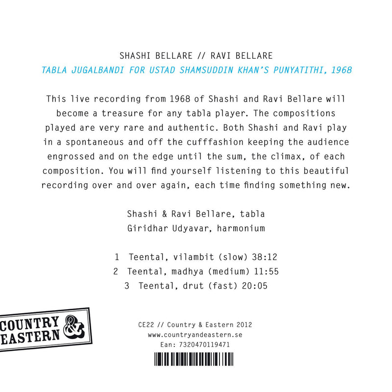 Country and EasternTabla Jugalbandi for Ustad Samshuddin KhanThis live recording from 1968 of Shashi and Ravi Bellare will become a treasure for any tabla player. The compositions played are...