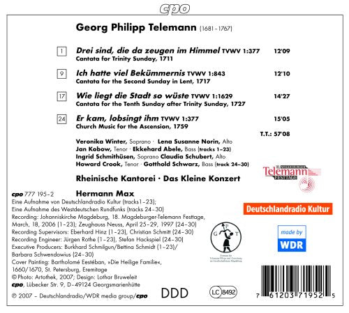 Includes cantata(s) by Georg Philipp Telemann. Ensembles: Rheinische Kantorei, Das Kleine Konzert. Conductor: Hermann Max. Soloists: Veronika Winter, Lena Susanne Norin, Jan...