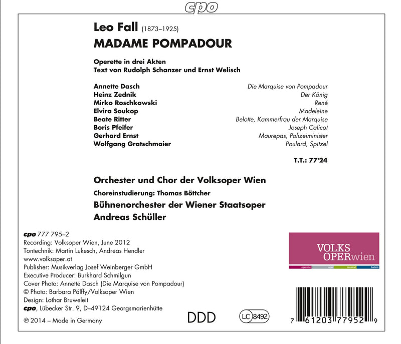 FALL Madame Pompadour • Andreas Schüller, cond; Annette Dasch ( Madame Pompadour ); Heinz Zednik ( King ); Mirko Roschkowski ( Count René d’Estrades ); Elvira Soukop ( Madeleine ); Beate Ritter ( Belotte ); Boris Pfeifer ( Joseph Calicot ); Gerhard Ernst ( Maurepas ); Vienna Volksoper Ch & O • CPO 777795-2 (77:24) Live: Vienna 6/8/2012