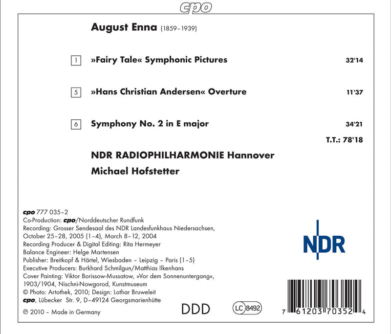 August Enna (1859-1939) was entranced by the stories of Hans Christian Andersen, as both the eponymous overture and his "Fairy Tale" Symphonic Pictures show. Actually, the identity of the fairy tales is never revealed in what essentially is a four-movement symphony (or "symphonic suite") somewhat akin, in spirit if not actual sound, to Rimsky-Korsakov's Antar or Scheherazade. The music, as you might expect, is tuneful and attractive, though both here and in the Second symphony there's rhythmic stiffness, a "four-square" quality to Enna's writing that prevents the music from achieving an effortless feeling of movement in its quicker sections. Still, if you're attracted to traditional Romantic music then these works by a minor but nonetheless appealing composer are worth sampling. Certainly the performances under Michael Hofstetter lack nothing in energy and commitment, the orchestra plays quite well, and the sonics are up to CPO's usual high standard.