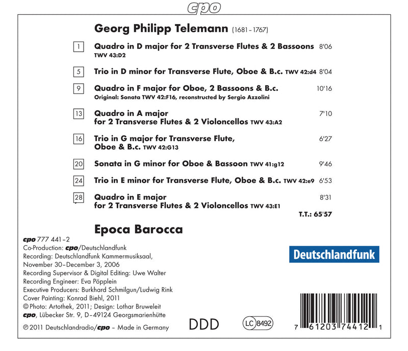 One of the dramatic features of the serenata is the representation of the characters. In particular The Spirit of War and Timidity are remarkable, as well as Envy. The characteristics of these protagonists are impressively explored by the singers. In the oratorio it is the role of Negligence which attracts attention. Here Immo Schröder shines in his humorous portrayal of this character. Veronika Winter gives an immaculate performance of the role of Hammonia. As Germany's Guardian Spirit she sings the last aria of this work, 'Ergreifet den Degen' (Grip the sword) which is quite virtuosic. But most arias are pitched at a considerable technical level, and Telemann again shows his creative spirit, not only in the vocal parts but also in the instrumental score.