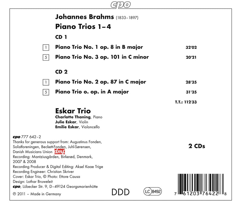 The Eskar Trio have established themselves as one of Denmark’s leading chamber music ensembles and Cpo are proud to present their interpretation of Johann Brahms’s Piano Trios.