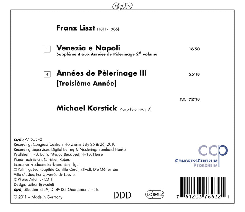 The German pianist Michael Korstick performs Liszt’s last major piano cycle, the Années de Pèlerinage – Troisième Année from 1883, written in the latter stage of his life when he visited Rome, Weimar and Budapest. Also featured on this disc is a supplement to Années de Pèlerinage II: Venezia e Napoli.
