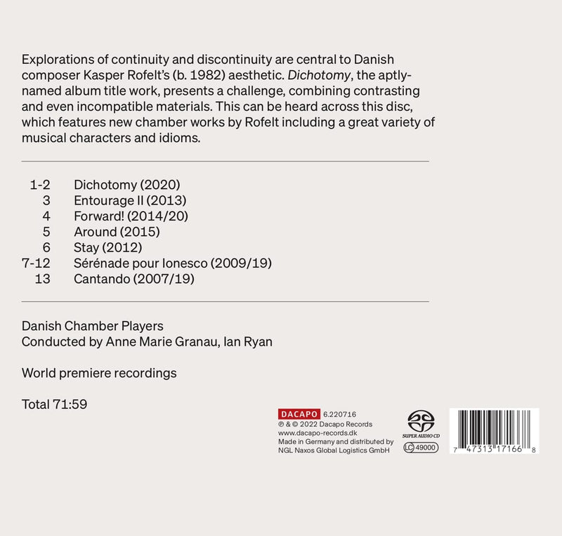 Explorations of continuity and discontinuity are central to Danish composer Kasper Rofelt’s (b. 1982) aesthetic. Dichotomy, the aptly- named album title work,...
