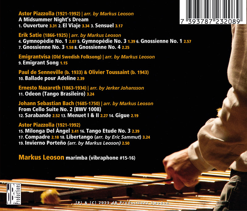 Swedish award-winning percussionist Markus Leoson presents his own and other's arrangements for marimba of favourite composers such as Astor Piazzolla, Erik Satie...