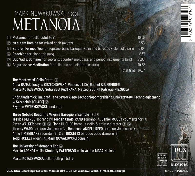 On SaleDUXNowakowski: Metanoia / Monteverdi Cello Octet, Three Notch'd Road, University of Memphis Trio