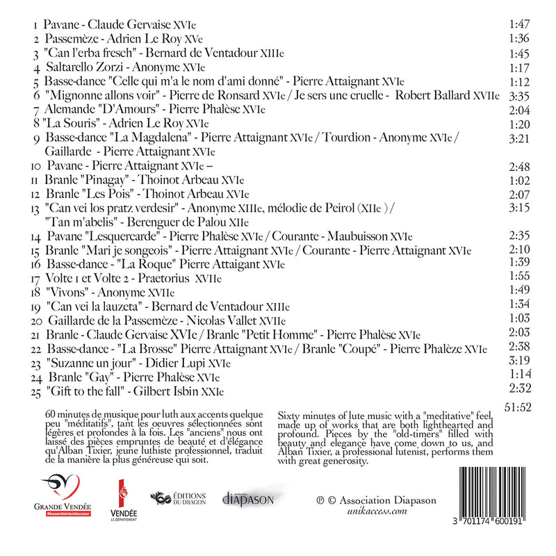 Sixty minutes of lute music with a « meditative » feel, made up of works that are both lighthearted and profound. Pieces...