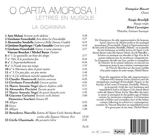 From the apparition of the stile rappresentativo (Monteverdi's famous Lettera Amorosa) and the monophonic madrigal (Frescobaldi, Negri), to the heyday of bel...