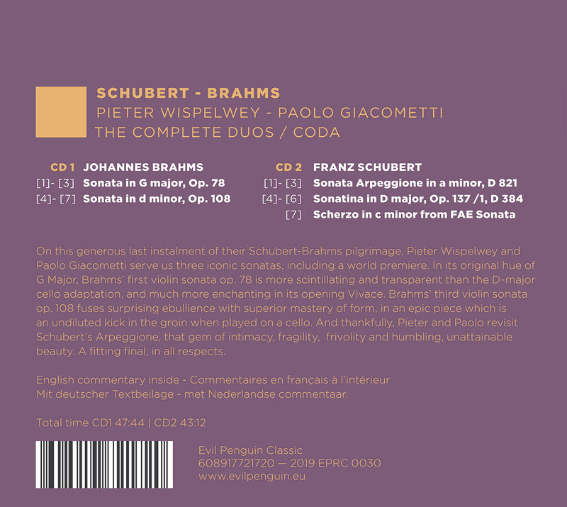 On SaleEvil PenguinV5: THE COMPLETE DUOSOn this generous last installment of their Schubert-Brahms pilgrimage, Pieter Wispelwey and Paolo Giacometti serve us three iconic sonatas, including a world...