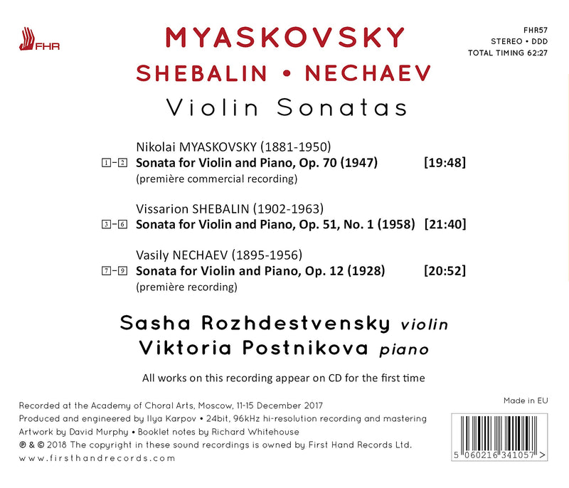On SaleFirst Hand RecordsMyaskovsky, Shebalin & Nechaev: Violin SonatasThe three violin sonatas on this release are by composers who had enjoyed a direct professional relationship during the period between the...