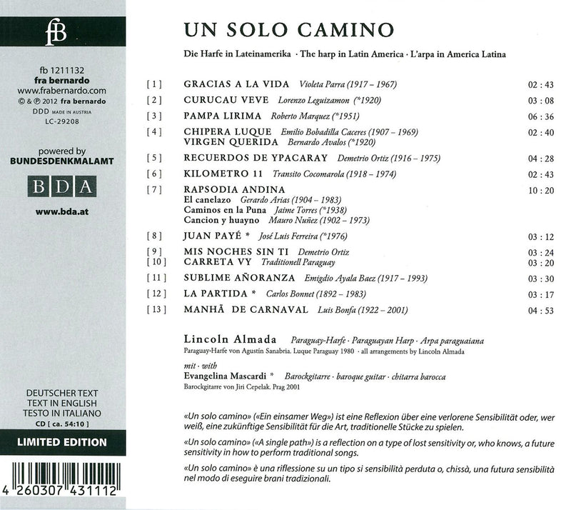Fra BernardoUn Solo CaminoIn Paraguay, the harp still uses the old techniques that have long been lost in Europe. Lincoln Almada melds these techniques to...