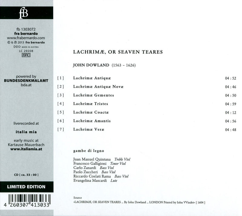 Fra BernardoDowland: Lachrimae or Seaven TearesThe Italian Gambe di Legno has evolved into one of the leading ensembles of it's kind in recent years. Originally founded as...