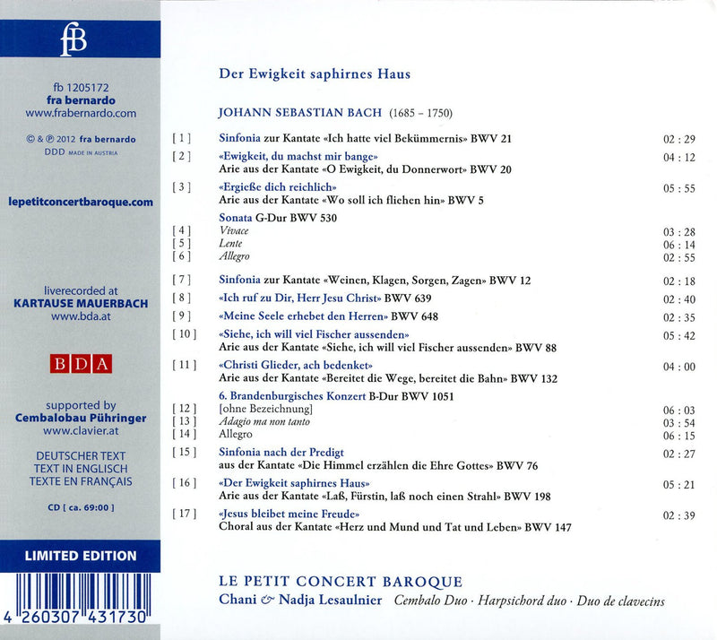 Fra BernardoDer Ewigkeit saphirnes HausThe harpsichord duo Le Petit Concert Baroque studied with Pierre Hantai, Elisabeth Joy and teachers at the Schola Cantorum Basiliensis. The sisters...