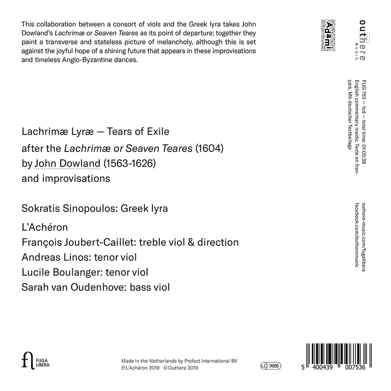 Fuga LiberaLachrimæ Lyræ - Tears of ExileThis collaboration between a consort of viols and the Greek lyra takes John Dowland's Lachrim� or Seaven Teares as it's point of...