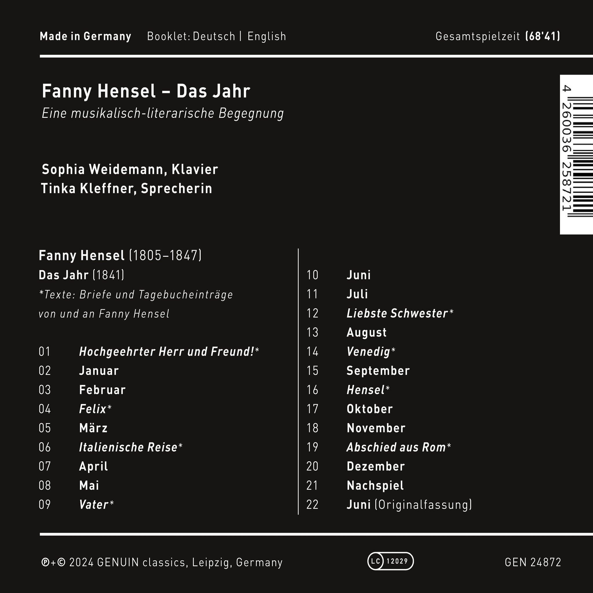 Pianist Sophia Weidemann and actress Tinka Kleffner present a musical-literary encounter with the exceptional composer Fanny Hensel in their new GENUIN album,...