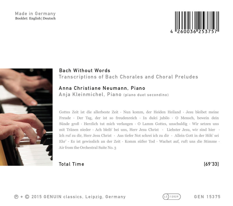 The piano duo of Anna Christiane Neumann and Anja Kleinmichel bring Bach Without Words their Genuin debut containing transcriptions of chorales, chorus...