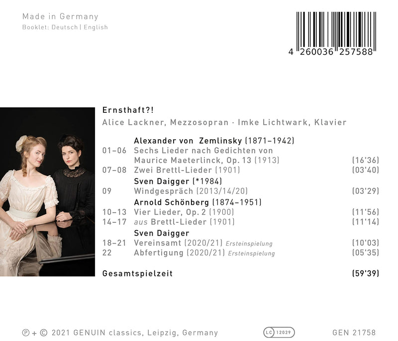 GenuinErnsthaft?! - Witz und Wahn in Liedern von Zemlinksy, Schönberg und Daigger / Lackner, Lichtwark, Daigger