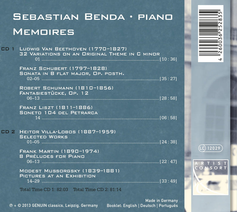 This new double CD of the Artist Consort series is dedicated to the great pianist Sebastian Benda and comprises recordings from 1961-1994....