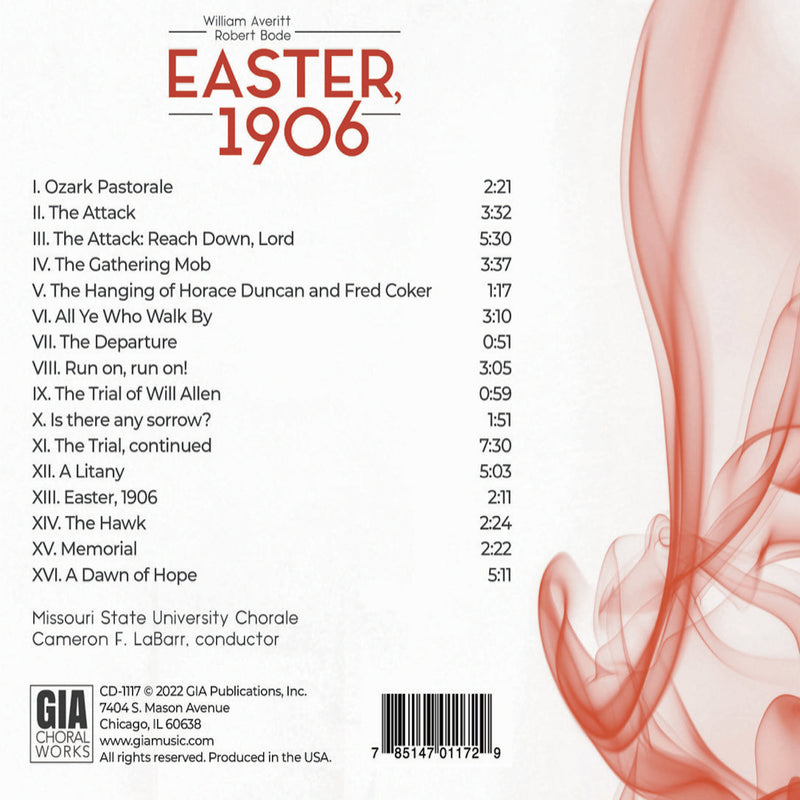 Easter, 1906 recounts one such event. It is the dramatic true story of the lynching of three innocent black men in Springfield, Missouri, over Easter weekend, 1906. Poet Robert Bode has collected material from historical documents of the period and created new poems that reflect upon this tragic event. In turn, Bode’s words are here set to music for double choir, soloists, spoken narration, piano four-hands, and two percussionists…” (William Averitt)