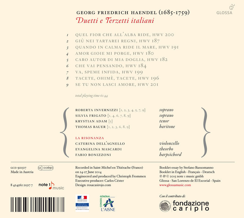 George Frideric Handel's Duetti da camera from La Risonanza represent a welcome extension of the ensemble's award-winning series of Handel solo cantatas...