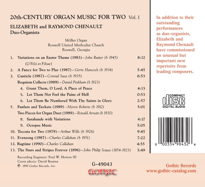 Gothic20th Century Organ Music for Two, Vol. 1Elizabeth and Ray Chenault have commissioned an unusual but important new repertoire from leading composers: organ music for two to play at...