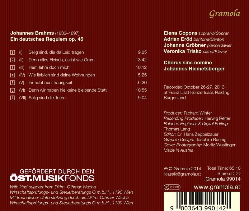 "•On their third recording for Gramola, Johannes Hiemetsberger and his Chorus sine nomine devote themselves to the German Requiem op. 45 by...