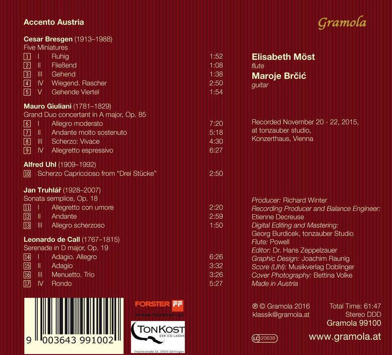This exciting and diverse collection of 19th and 20th century Austrian works is performed by Austrian flutist Elisabeth Most and guitarist Maroje...