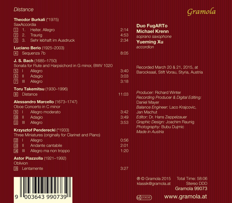 Distance features the unusual combination of accordionist Yueming Xu with saxophonist Michael Krenn in repertoire that ranges from the baroque to contemporary...