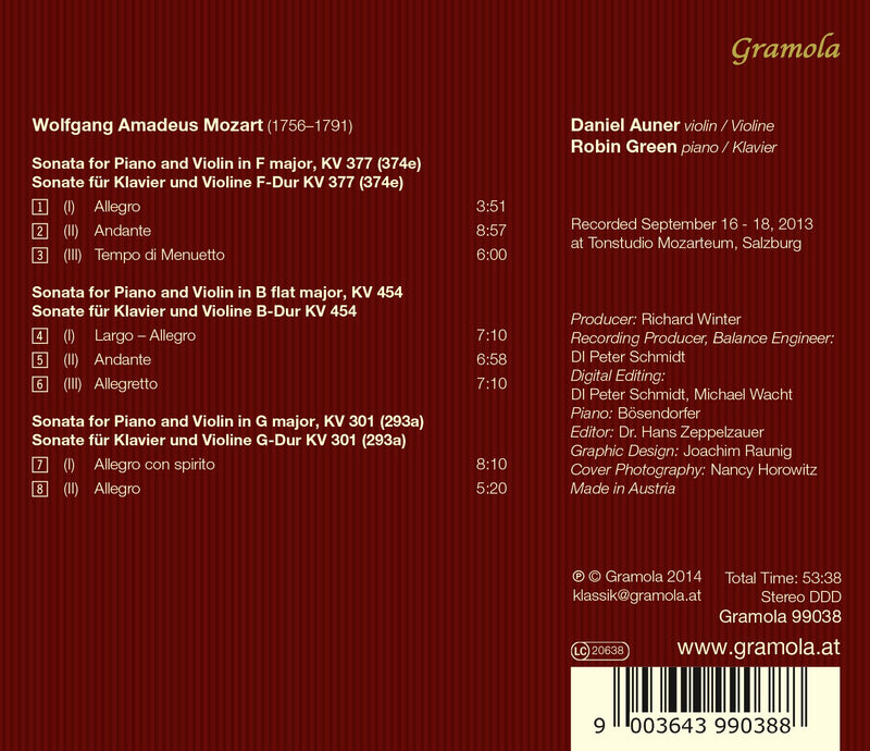 "•Intensive studies of the autographs of Mozart's works have influenced the Vienna-born violinist Daniel Auner in his interpretation of Mozart’s chamber music....